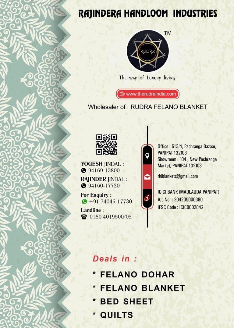 Since 1975, Rudra Blankets has been a trusted name in premium home furnishings, delivering quality and innovation from India’s textile hub, Panipat, as a wholesaler and distributor.